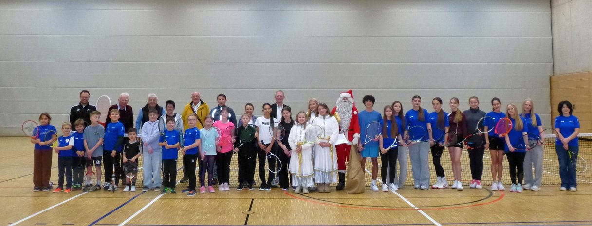 In der Vorweihnachtswoche bekamen die Schülerinnen und Schüler der Treuchtlinger Schulen, die am Gemeinschaftsprojekt des Kultusministeriums und des BLSV „Sport nach 1 in Schule und Verein – Tennis“ teilnehmen, in der Sene-Sporthalle traditionell vorweihnachtlichen Besuch vom Nikolaus. In diesem Jahr gab es aber eine Riesenüberraschung für die zahlreichen Tennis-Kids, die anwesenden Eltern und auch die Schulleitungen der Grundschule und Senefelder Schule Treuchtlingen. Erstmals in der inzwischen schon traditionellen Veranstaltung trat nicht nur der mit Spannung erwartete Nikolaus vor die Besucher. Zur freudigen Überraschung erschien in diesem Jahr auch das Treuchtlinger Christkind (Maxi Strobl) mit seinen zwei Engeln (Liv Görke und Lina Kohler), um vorweihnachtlich Spaß und Freude in der Sporthalle zu verbreiten. Dass in diesem Jahr auch das Christkind erschien, ist sicherlich der Tatsache zu verdanken, dass Maxi selbst als begeisterte Tennis-Schülerin am Projekt „Sport nach 1 in Schule und Verein“ teilnimmt, wie Moderator und Clubleitungsmitglied Günter Grzega erläuterte. Grzega startete seine Begrüßung mit Projekt-Leiter Herbert Tschepa, Treuchtlingens „Mister Tennis“, denn ohne dessen großartigen und unermüdlichen Einsatz seit fast 20 Jahren wäre das in weitem Umkreis wohl erfolgreichste Schule- und Sport-Projekt nie Realität geworden. Rund 80 Schülerinnen und Schüler nehmen aktuell am Tennis-Wintertraining teil. Moderator Grzega übermittelte auch ein „Herzlich Willkommen“ an Grundschulleiterin Nicole Hohmann und an die Führungsriege der Senefelder-Schule, nämlich Susanne Rathsam (Leiterin Mittelschule), Realschul-Rektor Stefan Burzler und den neuen Chef der Senefelder-Schule, Manfred Roppelt. Dabei bedankte er sich ebenso herzlich für die seit Jahren vorbildliche und wertschätzende Zusammenarbeit. Er bat die Schulleiterinnen und Schulleiter, den Dank der Tennisclubleitung sowie des Trainerteams mit Chef-Trainer Stephan Böhm an die Lehrkräfte, das Sekretariat, das Hausmeisterteam sowie die Zweckverband-Verantwortlichen zu übermitteln. Sein Dank galt auch Heinz Michel, der als unverzichtbarer „Mann im Hintergrund“ seit Jahren die umfangreichen administrativen Aufgaben für das Projekt professionell erledigt. Anschließend begrüßte „Sene“-Chef Manfred Roppelt, auch im Namen des Führungs-Teams beider Schulleitungen, die Tennis-Kids, anwesende Eltern und alle Gäste der vorweihnachtlichen Veranstaltung. Bei seinen Ausführungen merkte man dem neuen Schulleiter an, dass er das Projekt bereits „ins Herz geschlossen“ hat und uneingeschränkt Unterstützung leisten wird. Er sieht diese Gemeinschaftsaufgabe als ein Geschenk für die Kinder und Jugendlichen der Treuchtlinger Schulen, das es für eine gute Zukunft zu pflegen gilt. Nach dem Grußwort von Manfred Roppelt erschien dann das Christkind mit den beiden Engeln und alle lauschten fast andächtig dem Prolog des Treuchtlinger Christkinds. Dieser Auftritt war einfach eine wunderbare und unvergessliche Erfahrung für alle Anwesenden. Im Gefolge des Christkinds trat dann der mit Spannung erwartete Nikolaus alias Tennisclub-Chef Thomas Meinhold auf, der seine Rolle wie immer perfekt spielte. Mit Spaß und lustigen Sprüchen erreichte er sofort eine fröhliche Stimmung. Natürlich lobte er auch alle Anwesenden für das eifrige und begeisterte Mitmachen beim Tennistraining der Aktion „Sport nach 1 – in Schule und Verein“. Als der Nikolaus dann noch aus seinem großen, mit kleinen Geschenken gefüllten Sack alle Kinder und Jugendlichen eine vorweihnachtliche Überraschung bereitete, war die Begeisterung groß. Fazit der Kids: Die Tennis-Weihnachtszeit ist in diesem Jahr mit Christkind und Nikolaus einfach eine wunderschöne Zeit!